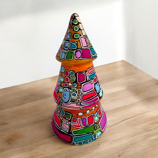 Medium Hand-Painted Wood 3 tiered Tree — 7 x 2.7x 2.7inches This isn’t just a holiday decoration. It’s a statement piece. Each tree is hand-paint...