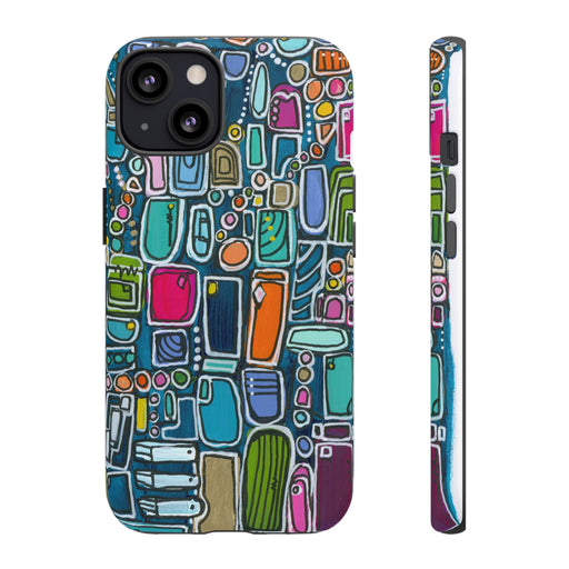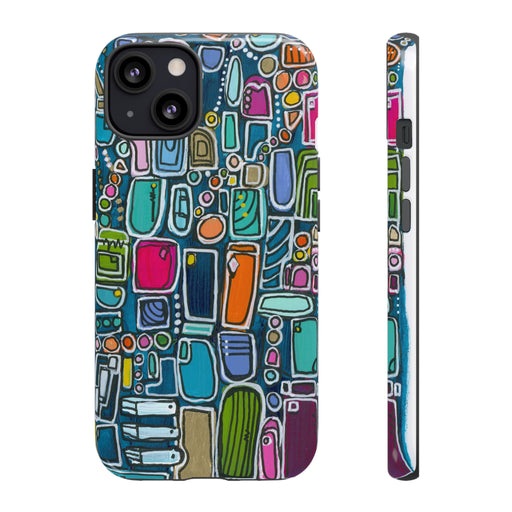 A vibrant protective phone case that turns your device into a small canvas. The abstract, mosaic-like artwork mixes deep blues, warm oranges, and m...
