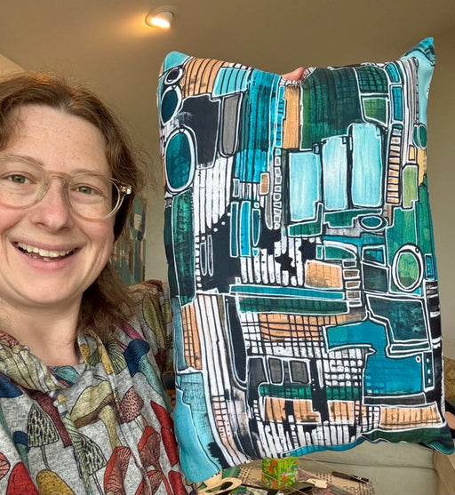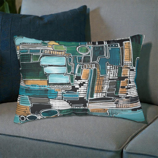 18" × 30" Width, in 18.00 Length, in 30.00 Rich terracotta, teal, mustard and onyx shapes interlock like a busy city map — each color...