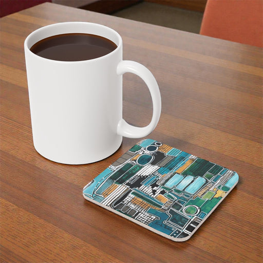 View full detailsAbstract Teal Geometric Coaster Set (4) — Modern Hardboard Coasters with Cork Bottom